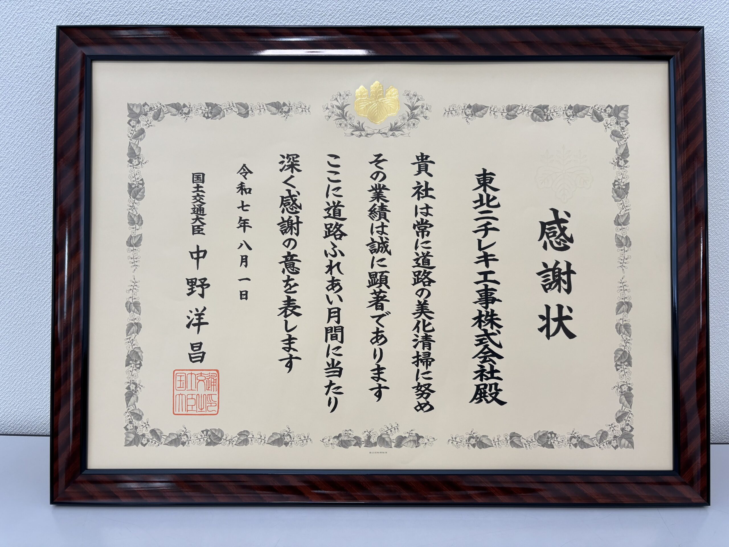 みやぎスマイルロード・プログラムの感謝状を頂きました。